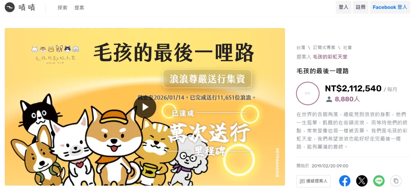 根據嘖嘖平台的募資頁面,「毛孩的彩虹天堂」宣稱其自2018年成立,從事浪浪送行,至2026年1月已陪伴11651隻流浪動物走完最後一程。至截稿前,「毛孩的最後一哩路」訂閱式專案仍在持續募資,頁面顯示目前仍有超過8千人贊助,每月估計有200餘萬元贊助款流向「毛孩的彩虹天堂」。