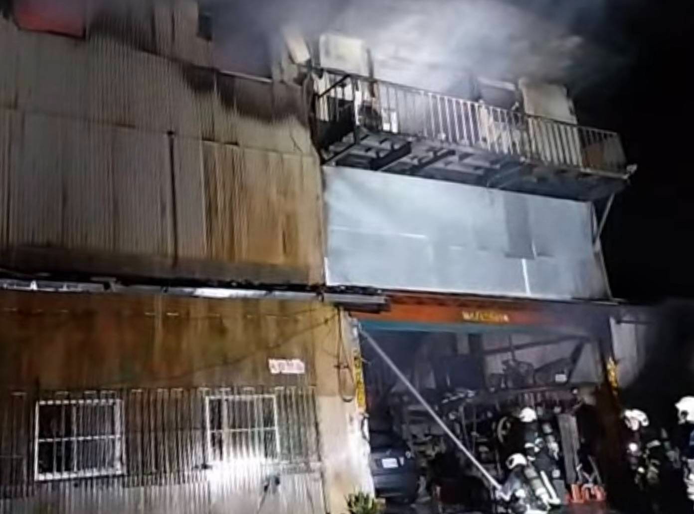 由於現場為鐵皮構造,加上內部堆放大量可燃物,火勢在短時間內全面延燒,火舌自窗戶與屋頂竄出,濃煙直衝天際,照亮整條巷弄。