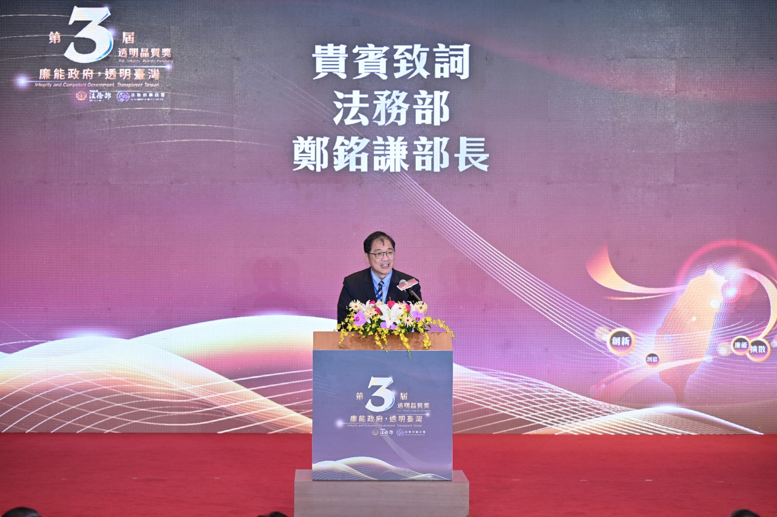 法務部長鄭銘謙在致詞中表示,我國自2018年起,每4年發布聯合國反貪腐公約國家報告,今年的透明晶質獎正是回應國際審查建議的具體行動。他指出,透明晶質獎自試辦以來,已成為引導公部門追求廉能治理的重要平台,並在2023年正式成為全國性獎項,至今已邁入第3屆。