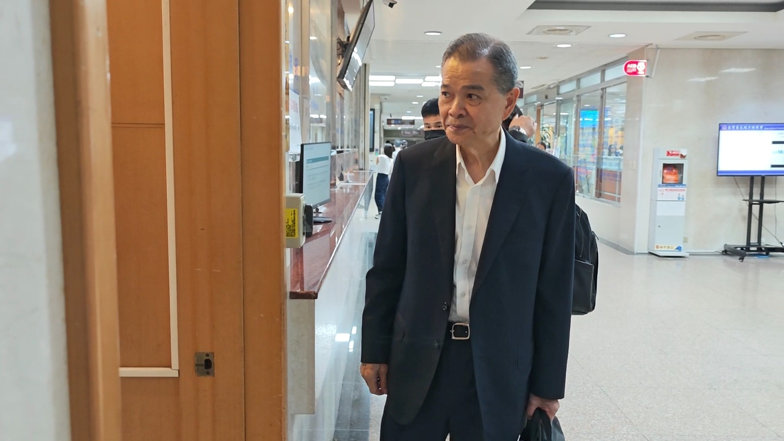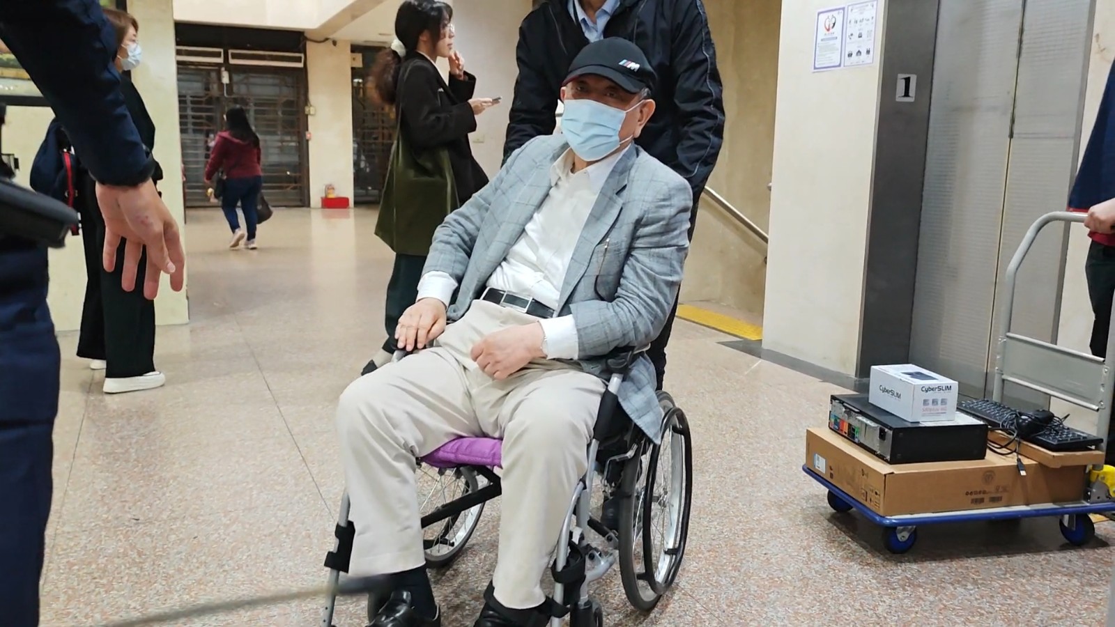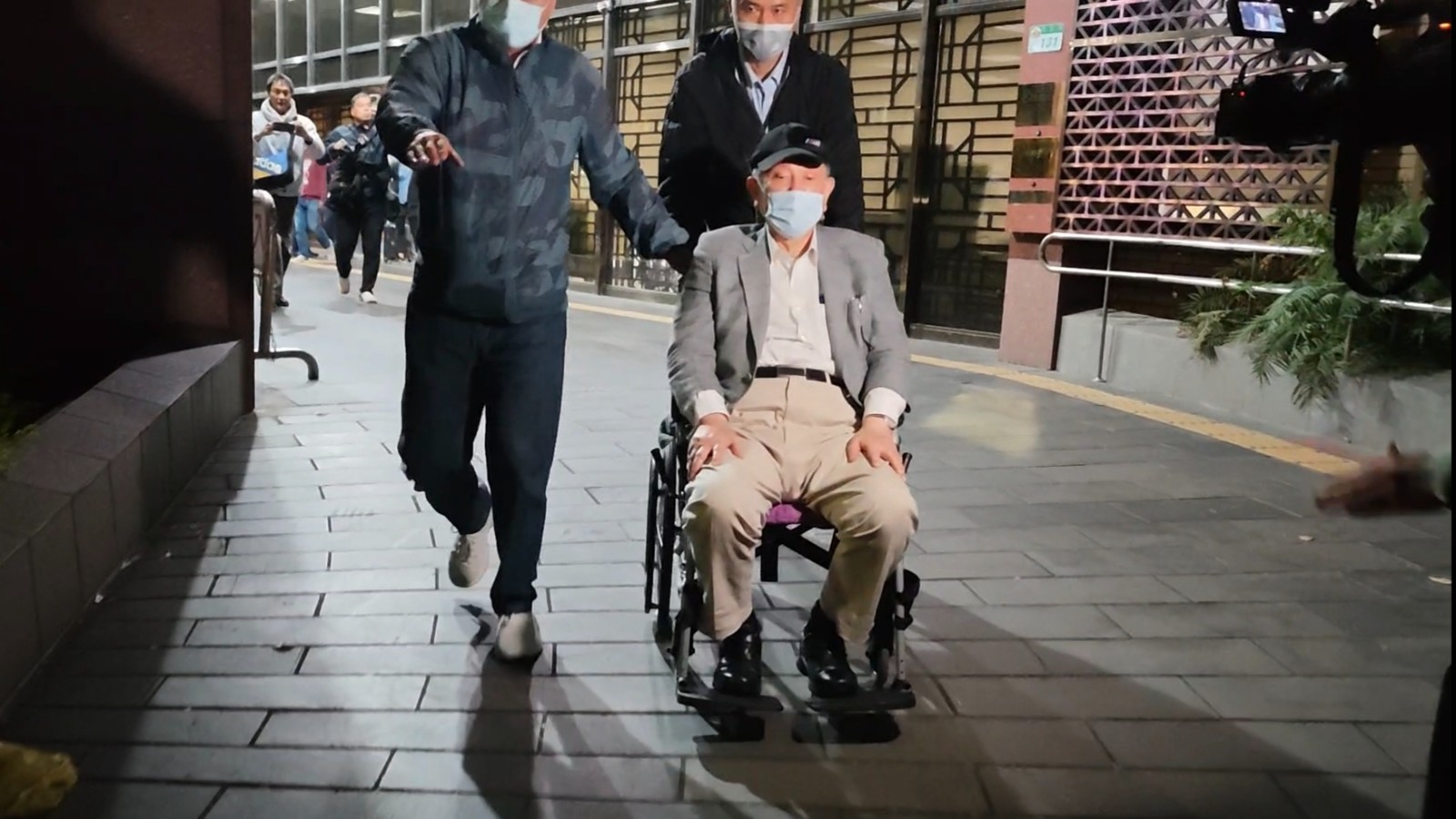 沈慶京以700萬元交保後,貼身親信幾乎用小跑步推著輪椅離開法警。呂志明攝