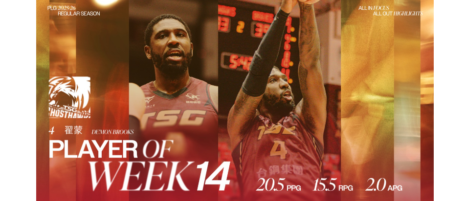 PLG今(27日)公布2025-26球季第14週單週MVP,由助台鋼獵鷹保住老二席次的洋將翟蒙榮獲此殊榮。