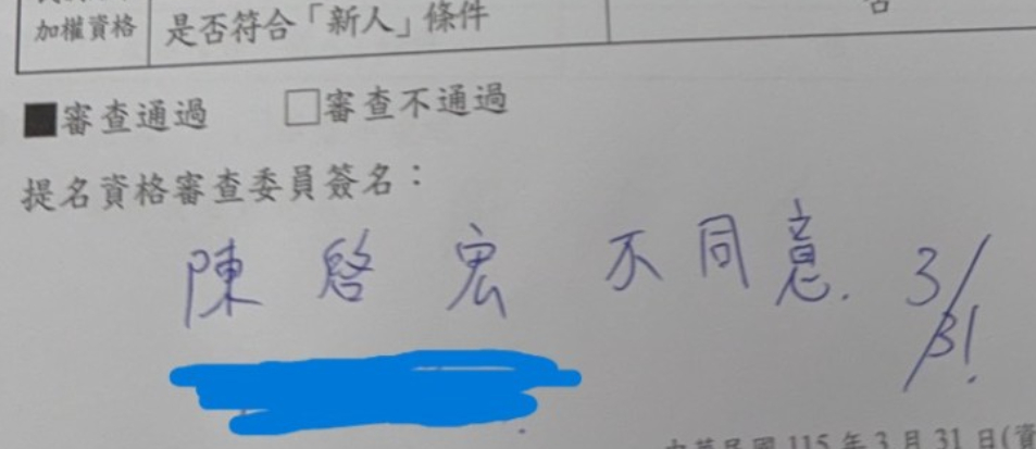 國民黨台北市黨部3月31日市議員提名資格審查小組將黨前副發言人賴苡任參與士林北投區市議員黨內初選資格否決,引發賴不滿,公布資格審查紀錄表,質疑竟因「資格審查委員陳啟宏」1人就否決自己參與黨內初選資格。但因公布圖表中有陳手機,陳今報警提告妨礙名譽與違反個資保護。