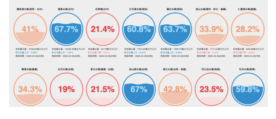 清明連假各地受鋒面影響,連日降下大雨,為水庫大補水,全台水庫挹注約1.9億噸水量,不過由於此波降雨主要集中在中部以北,對南部水情助益並不大,南部地區大部分水庫蓄水率仍維持在6成以下。不過氣象專家林得恩預測,週末起水氣增多,有機會為中南部地區帶來降雨,緩解告急的水情。
