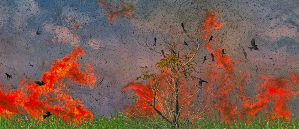 「自然攝影賽」上月公布得獎名單,「鳥類」項目首獎是風暴將至海邊的一群企鵝,另2張入圍決選的照片都彰顯了鳥兒的勇氣,一張作品中體型較小的烏鴉單挑明顯大隻的禿鷹,另外一張鳥群在大火中不閃不躲,等待林中小蟲不耐高溫飛起竄逃,好撿一頓白吃的午餐。