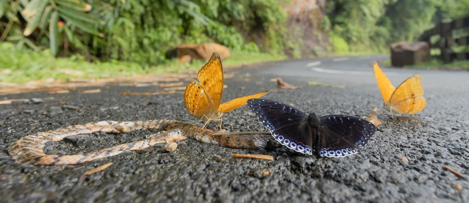 攝影獎「年度特寫攝影師」近日公布「挑戰賽:死亡與腐朽」得獎名單,印度攝影師馬利克拍到遭路殺的蛇,成了彩蝶營養和水分來源;荷蘭攝影師米恩豪特鏡頭下,一枝芽蟲媽媽雖困於蛛網,仍努力生產,趕在死前讓孩子出世,2張同時呈現生與死的照片都入圍挑戰賽優選名單。