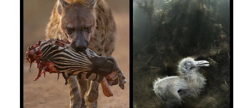 攝影獎「年度特寫攝影師」近日公布「挑戰賽:死亡與腐朽」得獎名單,南非攝影師克魯格拍攝鬣狗叼著斑馬斷頭的照片,獲挑戰賽首獎;法國攝影師莫德拉克拍攝一隻死去雛鳥靜靜沉在水底的照片獲三獎,射入水中的日光為畫面增添了近乎宗教性的靜謐與神祕感。