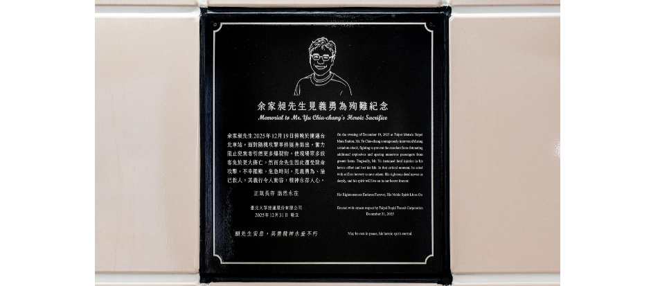 為感念在1219隨機殺人事件中挺身而出、捨己救人的余家昶先生,臺北捷運公司在北車設置永久紀念牌,向其義行致上最高敬意。今(1/13)日舉行揭示儀式,由台北市政府副市長林奕華、北捷公司董事長趙紹廉率相關主管出席,表達追思與懷念。