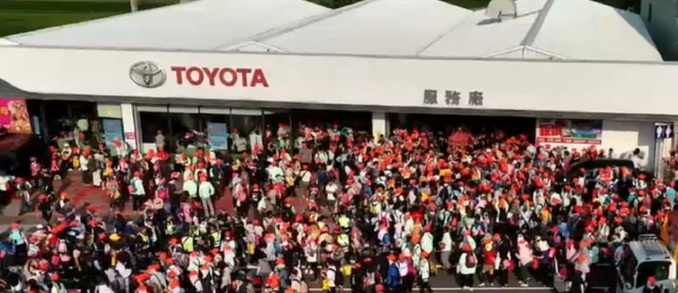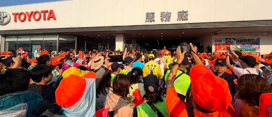 白沙屯拱天宮媽祖13日凌晨0時50分起駕後,粉紅超跑在香燈腳簇擁下一路往南行,進香第一天,早上7時19分停駕TOYOTA苑裡營業所;這是白沙屯媽祖近年來第11度停駕此地,不少香燈腳直呼:「媽祖來看望老朋友保養廠」、「媽祖的老朋友Toyota」、「媽祖來看望老朋友保養廠」。