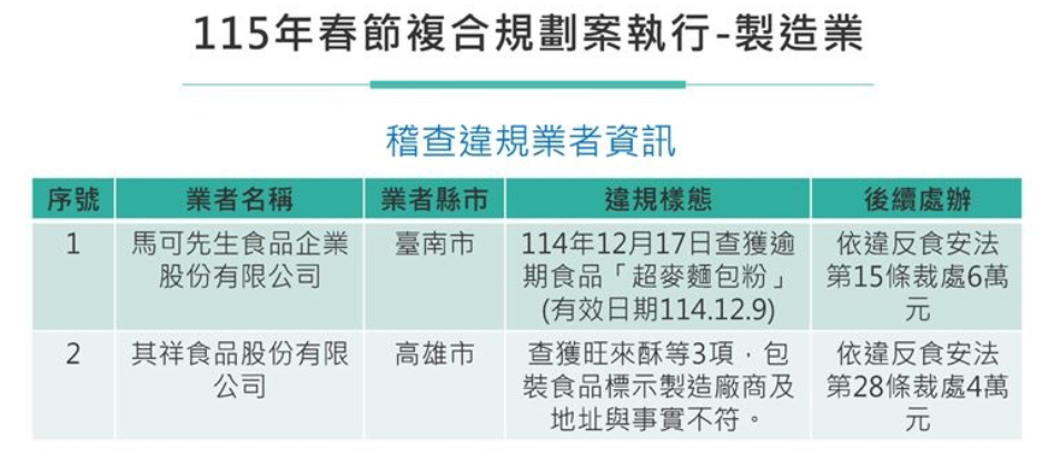 食藥署今(11)日公布「115年春節複合式規劃案」稽查結果,一口氣查獲2件貯存逾期食品,分別為「馬可先生食品企業股份有限公司」台南仁德廠內存放逾期8天的「超麥麵包粉」,以及「君達育樂事業股份有限公司」花蓮分公司存放逾期9天的「濃縮橙汁調飲」。儘管兩家業者皆未開封,仍依法各裁處新台幣6萬元。